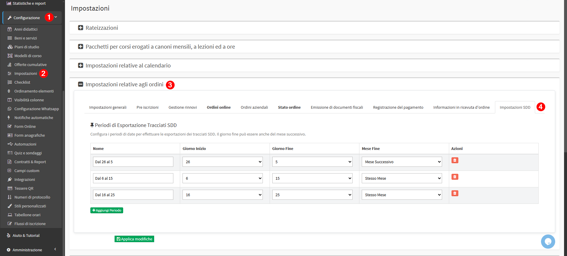 Per farlo sarà necessario accedere alla sezione Configurazione → Impostazioni → Impostazioni relative agli ordini → Impostazioni SDD e configurare i vari periodi desiderati compilando i campi Nome, Giorno inizio e Fine, Mese Fine.