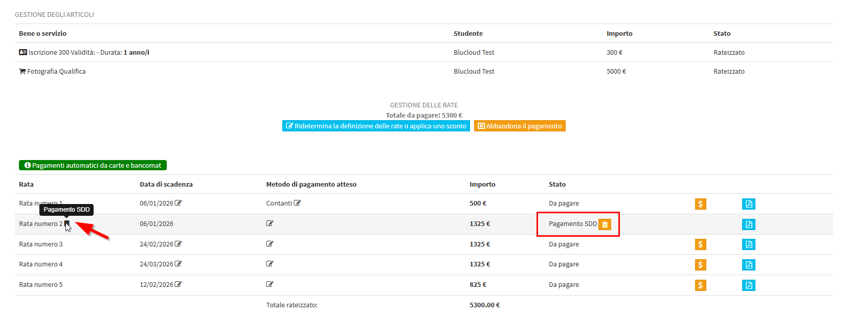 Il pagamento tramite SDD sarà indicato anche nella colonna Stato dove si avrà anche la possibilità di sganciare la rata dall’SDD con il tasto giallo.