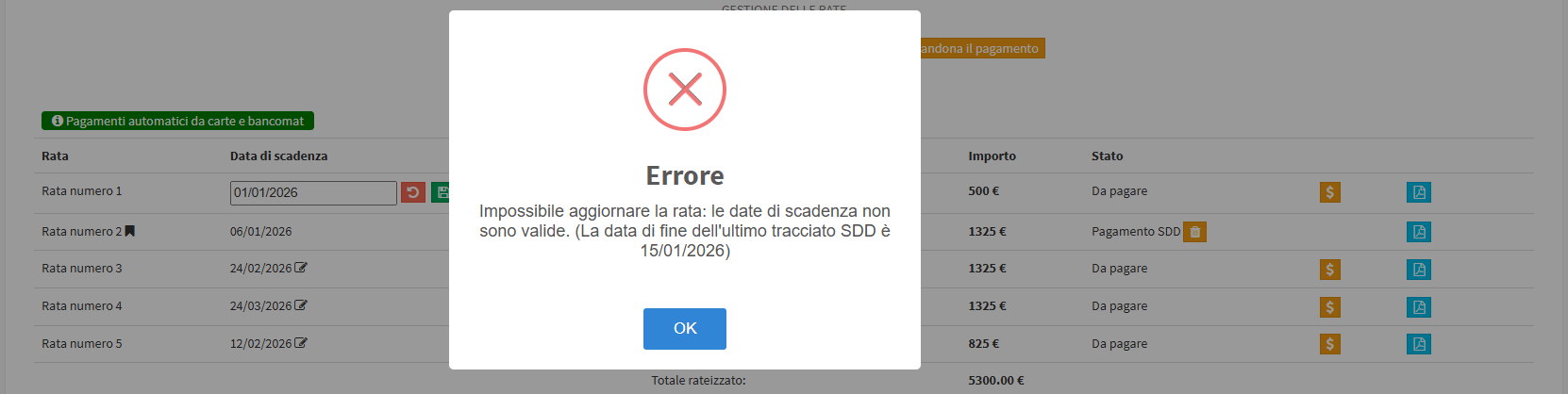 Per le rate non ancora esportate o sganciate dall’SDD sarà possibile alterarne la scadenza per includerle in un periodo specifico, la procedura di modifica è quella standard ma non sarà possibile inserire la scadenza all’interno di un periodo già esportato.