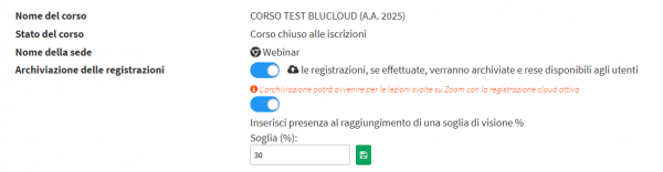 Accedendo quindi nella sua scheda sarà possibile abilitare l’opzione “Le registrazioni, se effettuate, verranno archiviate e rese disponibili agli utenti“, con questa opzione verrà attivata la registrazione delle lezione svolte nelle aule virtuali che verranno poi riportate nell’Agenda delle Lezioni, inoltre è possibile configurare la soglia percentuale richiesta agli studenti che visualizzeranno in un secondo momento la registrazione per risultare come frequentanti del corso, per farlo è necessario inserire la spunta “Inserisci presenza al raggiungimento di una soglia di visione %” e compilare l’apposito campo con la Percentuale richiesta: