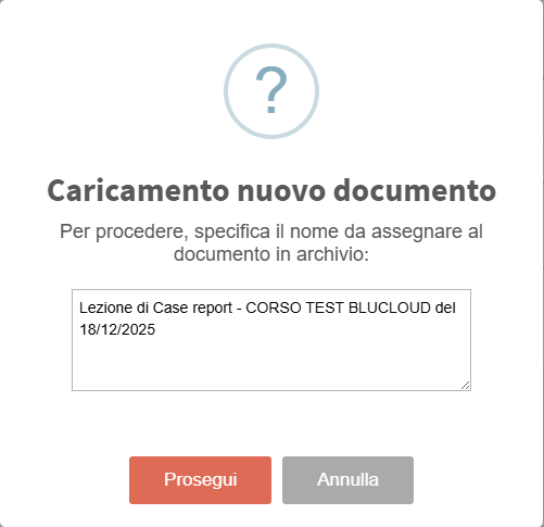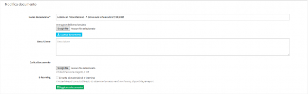 Qui sarà possibile modificare il nome e caricare nel campo “Carica Documento” una versione modificata della registrazione nel caso fosse stato necessario unire più registrazioni o tagliare alcune parti di quella originale: