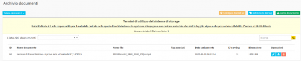 La registrazione sarà quindi visibile in Anagrafiche→ Documenti, qui verrà mostrato l’elenco di tutti documenti caricati a sistema dagli allegati dei corsi alle registrazioni delle lezioni, è inoltre possibile caricare manualmente delle nuove registrazioni tramite l’apposito pulsante “Carica documento“.