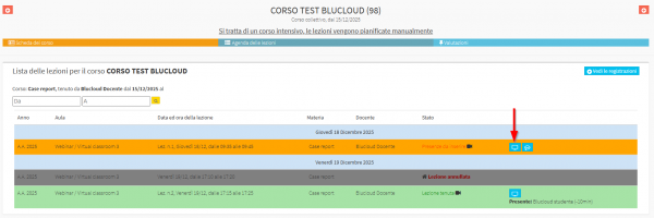 Terminata la configurazione del corso e svoltasi la lezione in una delle aule virtuali sarà possibile, accedendo all’agenda delle lezioni del corso verrà mostrata la lista delle lezioni e tra i pulsanti di gestione sarà possibile cliccare su “Visualizza le registrazioni salvate per questa lezione“: