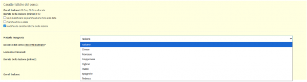 Valorizzare ora il checkbox “Modifica le caratteristiche delle lezioni” e modificare la materia dal menù a tendina Materia insegnata. Se il docente attuale del corso è collegato anche alla nuova materia scelta, esso verrà scelto di default; in caso contrario, verrà scelto uno dei docenti associati alla nuova materia e sarà possibile comunque sceglierne un altro dal relativo menù a tendina.