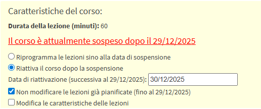 Valorizzare il checkbox “Riattiva il corso dopo la sospensione” ed inserire di seguito la data di riattivazione.